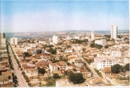 Fotografia da vista parcial do centro de Divinópolis. Na imagem em questão, José Valério demarcou alguns pontos importantes da cidade. O primeiro ponto é o edifício Frei Mariano, localizado na praça Benedito Valadares, sendo o segundo edifício da cidade de Divinópolis, o primeiro foi o edifício Alvimar Mourão. Ao lado do edifício Frei Mariano, vê-se o Santuário de Santo Antônio.
