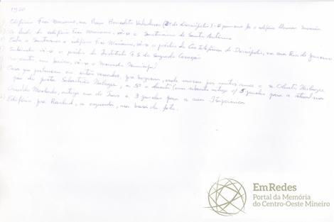 José Valério, Divinópolis, centro, edifício Frei Mariano, praça Benedito Valadares, casas, edifício Alvimar Mourão, Santuário de Santo Antônio, Companhia telefônica, rua Rio de Janeiro, Instituto Nossa Senhora do Sagrado Coração, Mercado Municipal, residências, José Nogueira, Sr. Olinto Milagre, Sebastião Milagre, rua Oswaldo Machado, rua Itapecerica, edifício José Rachid.