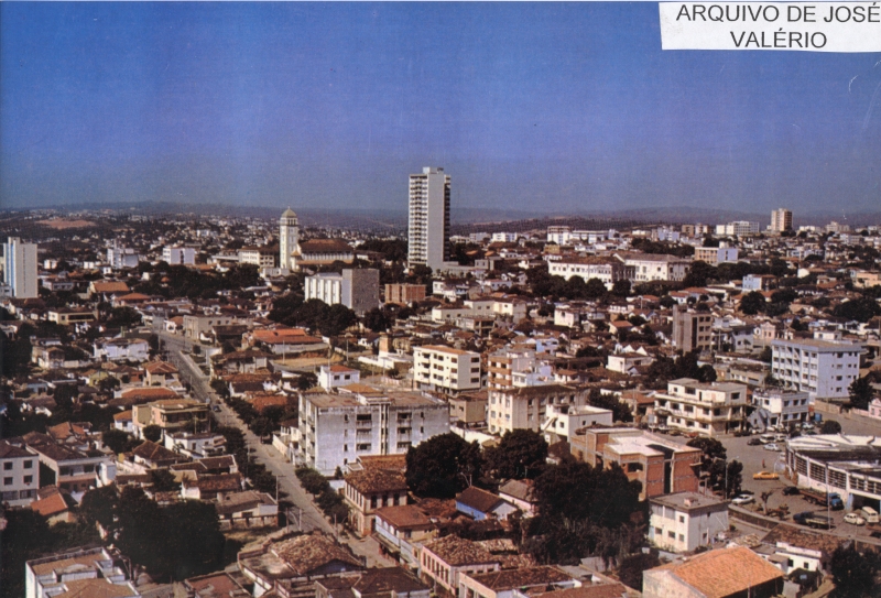 Fotografia da vista parcial do centro de Divinópolis. Na imagem em questão, José Valério demarcou alguns pontos importantes da cidade. O primeiro ponto é o edifício Frei Mariano, localizado na praça Benedito Valadares, sendo o segundo edifício da cidade de Divinópolis, o primeiro foi o edifício Alvimar Mourão. Ao lado do edifício Frei Mariano, vê-se o Santuário de Santo Antônio.