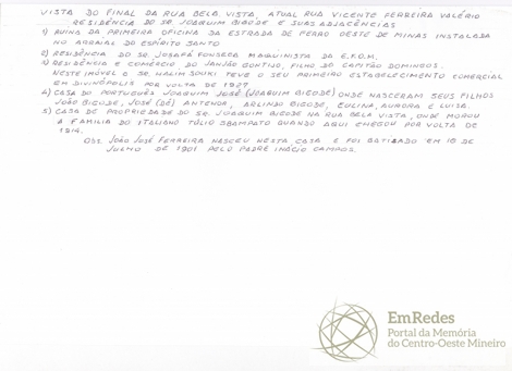 Na imagem em questão, José Valério numera alguns pontos do local. O primeiro ponto refere-se às ruinas da primeira oficina da estrada de ferro Oeste de Minas, instalada no Arraial do Espírito Santo. O segundo menciona a residência do Senhor Josafá Fonseca, maquinista da Estrada de Ferro Oeste de Minas. O terceiro é a residência e comércio do Janjão Gontijo, filho do Capitão Domingos. Neste imóvel o Senhor Halim Souki teve o seu primeiro estabelecimento comercial em Divinópolis por volta de 1927.
