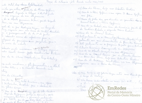 Nomes citados: Alonso Epifânio, Alberto Januário Valério, José Rodrigues Viegas, Padre Vicente Soares, Padre Bicalho, Frei Hilário, “Jota”, Alberto Coimbra Filho, Oswaldo Fernandes Costa, Francisco Luiz Carlos Amorim, Dona “Sinhorinha”, Senhor Rogério Xavier, Vitor “doido”, Benjamim Gontijo de Azevedo, “Piloto”, Luiz “Piloto”, Flávio Epifânio, Dona Mena Epifânio, Israel Pardini, Sr. Rabelo, Zé do Teodósio Rabelo, Mário Pardini, Manoel José Ferreira (Manoel Bigode), Joaquim Bigode, Arlindo, Alberto Carregal, Derval Pereira, Bibiana Michelini.