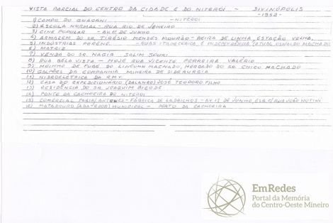 Fotografia da vista parcial do centro de Divinópolis e do bairro Niterói em 1952. Na imagem em questão, José Valério destacou alguns pontos importantes da cidade, os quais são: o Campo do Guarani; a Escola Normal Mário Casassanta, na rua Rio de Janeiro; o Cine Popular, na Avenida 1° de junho; e o armazém do senhor Tirésio Mendes Mourão, na beira da linha da estação velha.