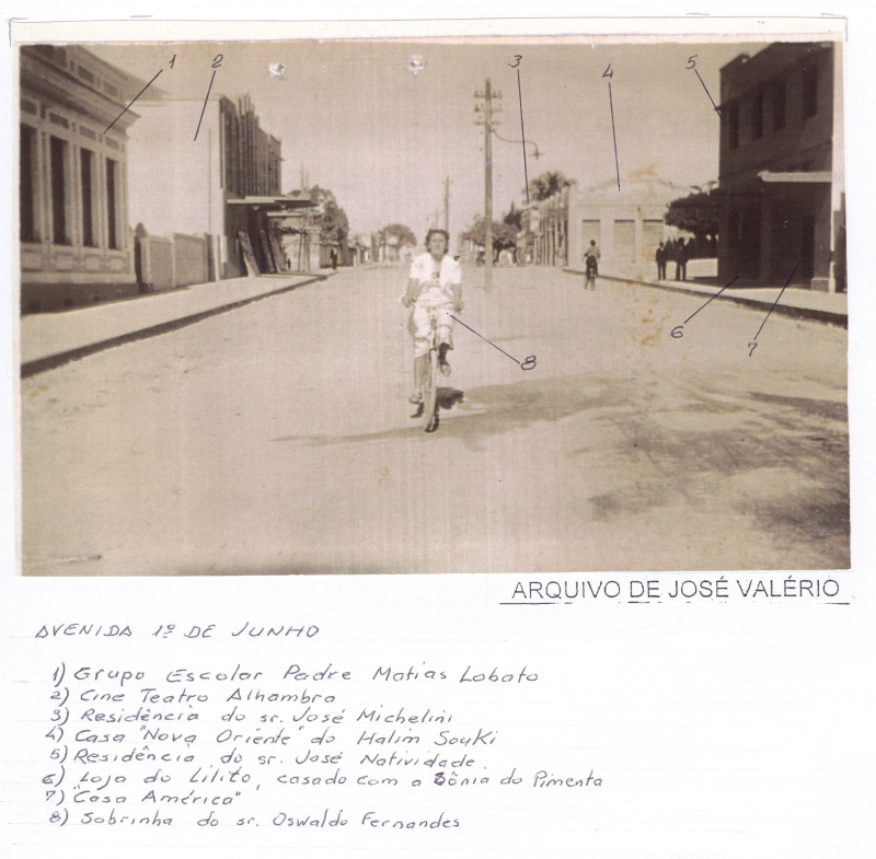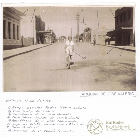 José Valério, Divinópolis, Avenida 1° de junho, Grupo Escolar Matias Lobato, Cine Teatro Alhambra, residências, José Michelini, José Natividade, Halim Souki, Lilito, Sônia, Pimenta, Oswaldo Fernandes, Casa “Novo Oriente”, loja, “Casa América”.