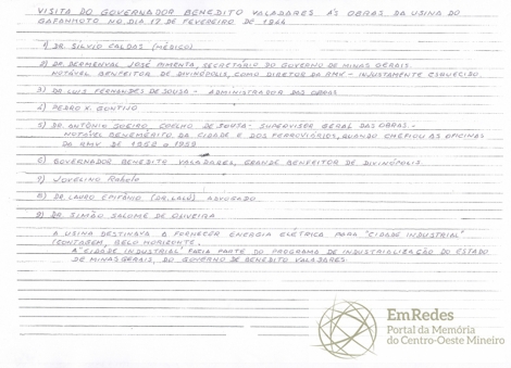 Visita do governador Benedito Valadares as obras da Usina do Gafanhoto no dia 17 de fevereiro de 1944 na cidade de Divinópolis. A usina destinava a fornecer energia elétrica para a “cidade industrial” (Contagem e Belo Horizonte), a qual fazia parte do programa de industrialização do estado de Minas Gerais, do governo de Benedito Valadares.