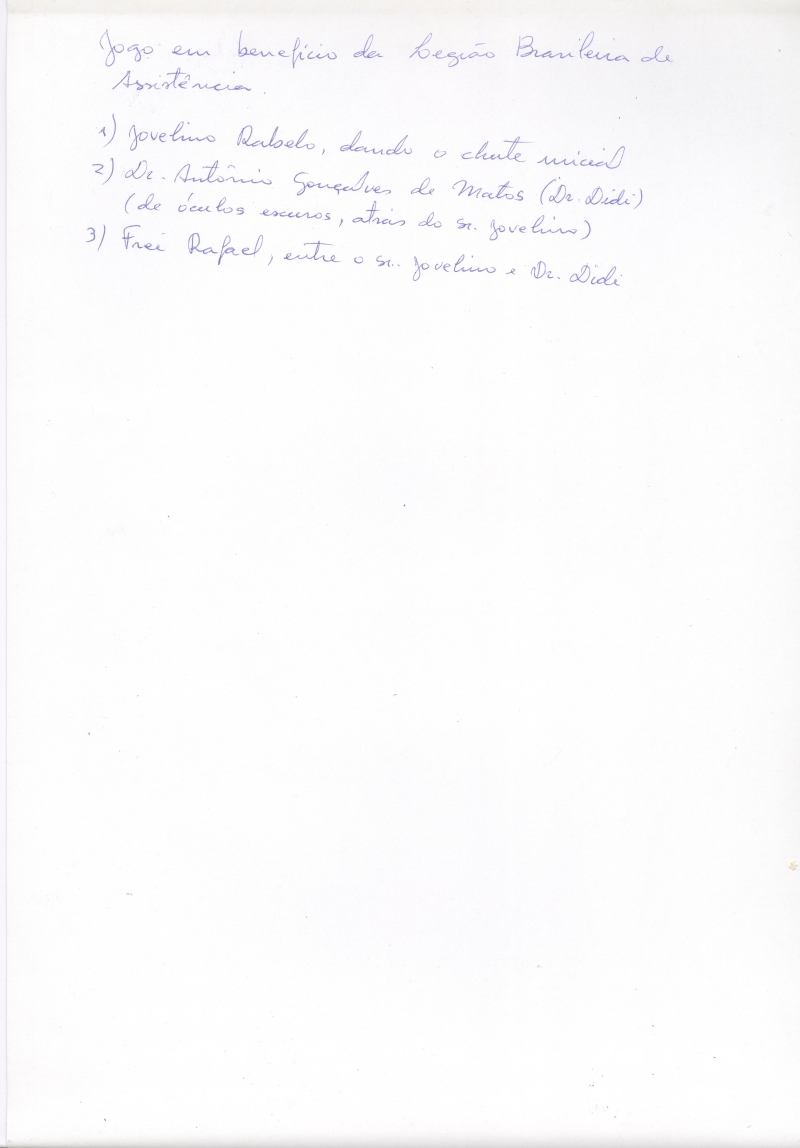 Senhor Jovelino Rabelo dando chute inicial, entre o ferroviário e o Curvelano, em benefício da LBA (Legião Brasileira de Assistência) - órgão assistencial público brasileiro, fundado em 28 de agosto de 1942, pela então primeira-dama Darcy Vargas, com o objetivo de ajudar as famílias dos soldados enviados à Segunda Guerra Mundial, contando com o apoio da Federação das Associações Comerciais e da Confederação Nacional da Indústria.