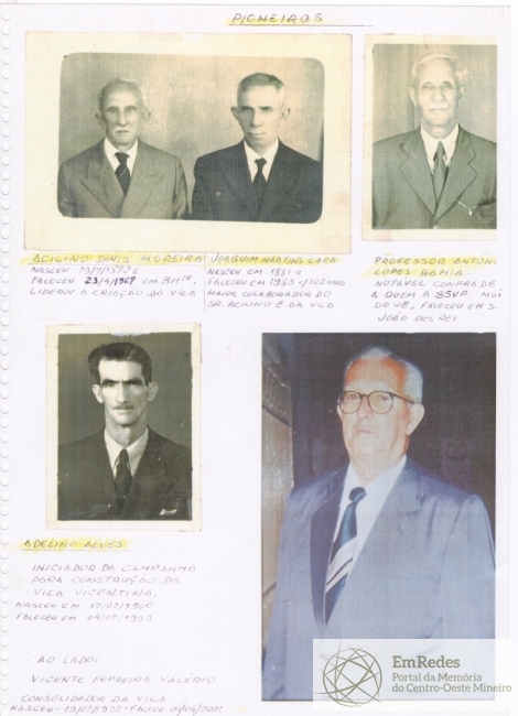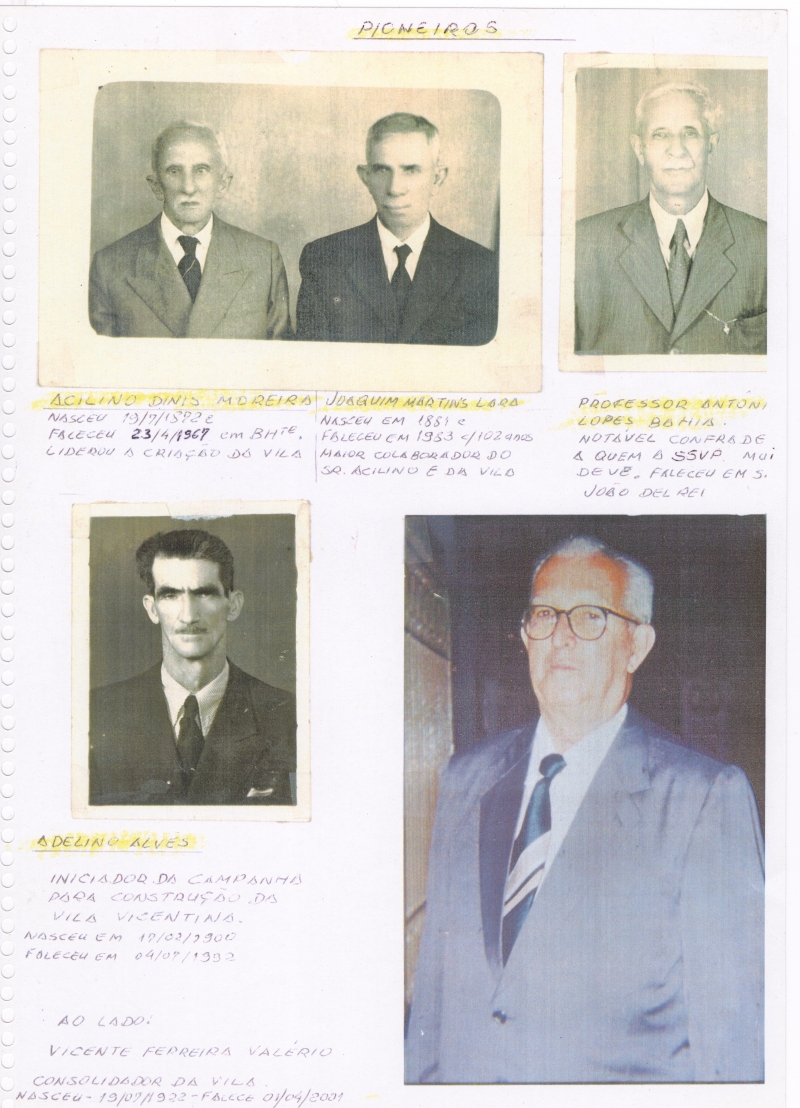 Pioneiros da campanha para a construção da Vila Vicentina: Aciliano Dinis Moreira, líder da campanha, nascido no dia 19 de Julho de 1872 e faleceu no dia 23 de Abril de 1967 em Belo Horizonte; Joaquim Martins Lara, nascido em 1881 e faleceu em 1983, era o maior colaborador do senhor Alcino e da Vila Vicentina; Professor Antônio Lopes Bahia, notável confrade da SSVP, que muito colaborou para a sociedade, e faleceu em São João del - Rei, Minas Gerais.