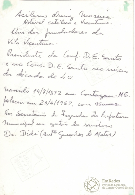 Fotografia do senhor Aciliano Diniz Moreira, notável católico e vicentino, nascido no dia 19 de julho de 1872, em Contagem, Minas Gerais. Foi um dos fundadores da Vila Vicentina, presidente da Conferência do Divino Espírito Santo e do Conselho do Divino Espírito Santo no início da década de 1940.