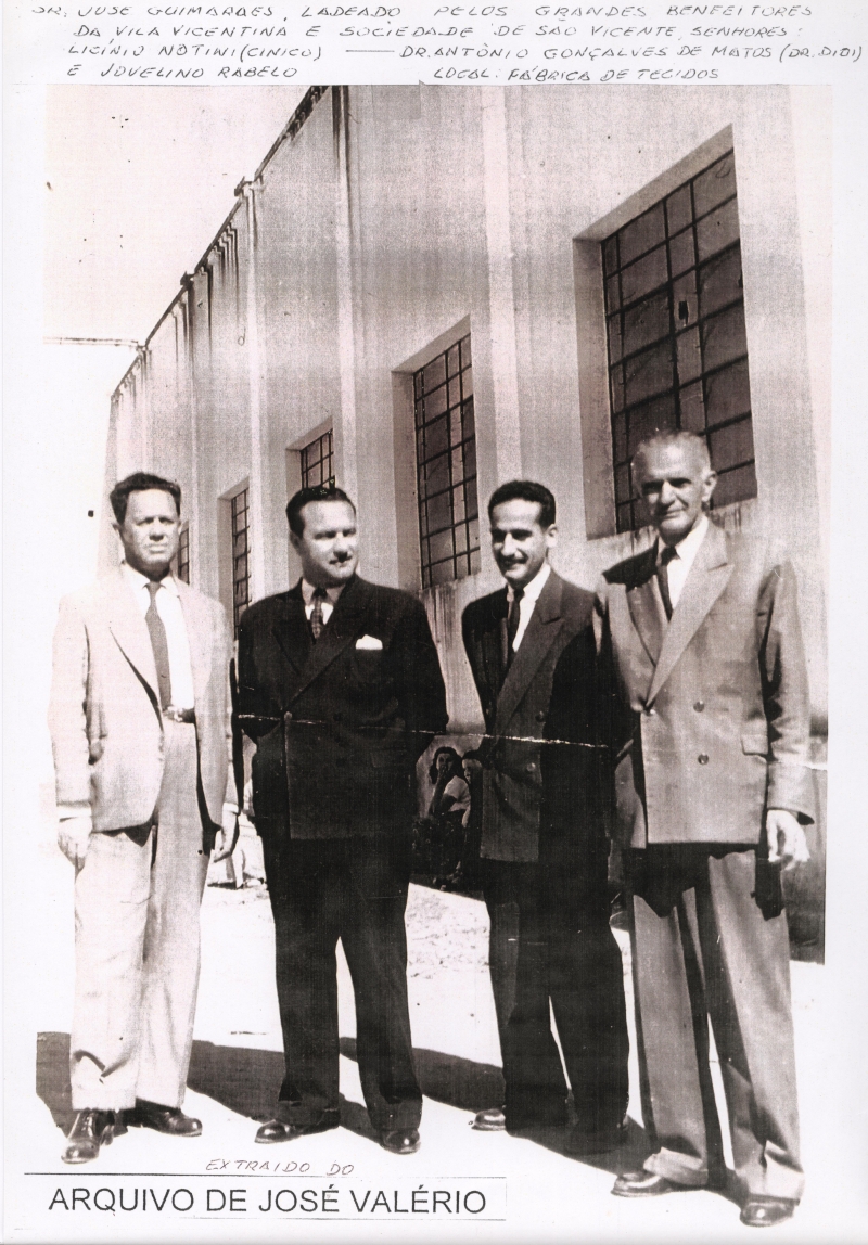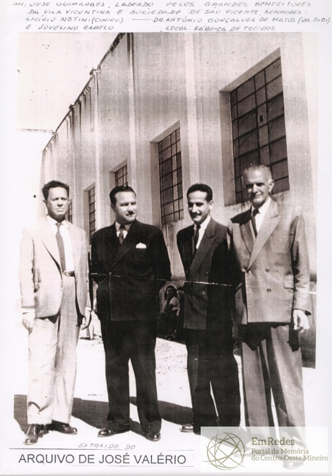 Fotografia retirada na fábrica de tecidos de Divinópolis em que se destaca o senhor José Guimarães, juntamente com os grandes benfeitores da Vila Vicentina e Sociedade de São Vicente, os senhores Licínio Notini (Ciníco), Doutor Antônio Gonçalves de Matos (Doutor Didi) e Jovelino Rabelo.