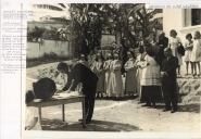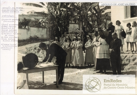 Benção da pedra fundamental para a construção da capela no dia 27 de Setembro de 1963, em que estavam presentes o senhor Vicente Valério, as freiras Madalena, Paulina, Maria Eli, Suzana e Eucênia, o senhor Antônio Fonseca de Faria, Dom Cristiano, Doutor Artur Albino Ribeiro e a senhora Maria Cordé Lia.