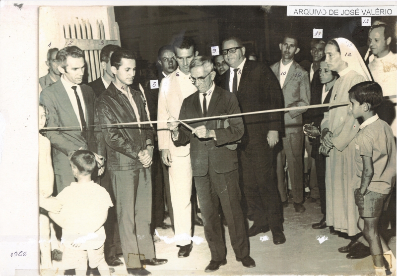 Descrição: Inauguração da luz no pátio da Vila Vicentina onde estavam presentes os senhores Otoni Olímpio de Oliveira; Rafael Assunção Vaz; Antônio de Castro; Doutor José Pedro Rodrigues de Oliveira (chefe da Cemig local); Oswander de Sousa; Rafael Fernandes; Joaquim Martins Lara; Doutor Walchir J. Resende Costa (prefeito municipal); Augusto dos Santos; José Valério; Adelino Alves; a Irmã Maria Eugênia e o senhor Vicente Ferreira Valério.