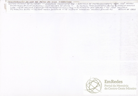 Descrição: Inauguração da luz no pátio da Vila Vicentina onde estavam presentes os senhores Otoni Olímpio de Oliveira; Rafael Assunção Vaz; Antônio de Castro; Doutor José Pedro Rodrigues de Oliveira (chefe da Cemig local); Oswander de Sousa; Rafael Fernandes; Joaquim Martins Lara; Doutor Walchir J. Resende Costa (prefeito municipal); Augusto dos Santos; José Valério; Adelino Alves; a Irmã Maria Eugênia e o senhor Vicente Ferreira Valério.