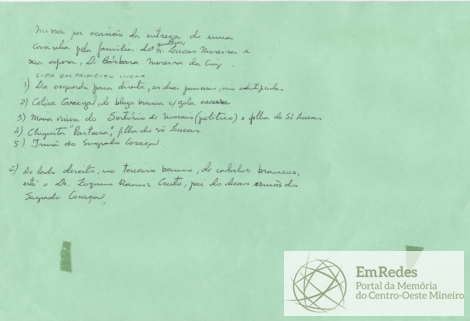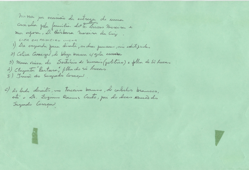 Missa da entrega da casa doada pelo senhor Lucas Moreira da Cruz, sua esposa Dona Bárbara Moreira Cruz e família. Estavam presentes também a Dona Lica, filha do casal Lucas e Dona Bárbara M. Cruz; Celíca Carregal; Maria, filha do senhor Lucas e viúva do senhor Sertório de Morais (político); Chiquita (parteira), filha do senhor Lucas; Doutor Zózimo Ramos Couto, grande benfeitor dos pobres e pai de duas irmãs do Sagrado Coração; Leonardo Manoel Gomide e Sebastião dos Santos.