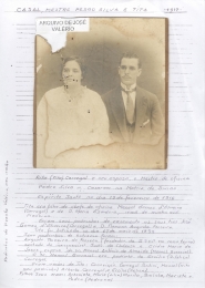 Casal, mestre Pedro Silva e Tita – 1917. Rita (Tita) Carregal e seu esposo, o mestre de oficina Pedro Silva. Casaram na Matriz do Divino Espírito Santo no dia 19 de fevereiro de 1916. Tita era filha do chefe de oficina Manoel Gomes de Oliveira (Carregal) e de D. Maria Esmécia, irmã de minha avó Flausina. Foram seus padrinhos de casamento os seus tios José Gomes de Oliveira (Carregal) e D. Flausina Augusta Ferreira. Tita foi batizada no dia 07 de maio de 1899. Seus padrinhos de batismo foram: Augusto Teixeira da Fonseca (fundador da SSVP em nossa terra) cunhado do inesquecível Sinhô da Chácara e Elídia Maria de Jesus, esposa do Sr. Manoel Antônio de Almeida (Manoel Burraial). O Sr. Manoel Burraial era padrinho da Ercília (D. Celica) Carregal. Eram irmão da Tita: Conceição Carregal Pardini, Manoel (Nito meu padrinho), Alberto Carregal, e Ercília (Celica). Filhos seus eram: Antonieta, Maria (Lilia), Murilo, Dicíolo, Mariete e Pedro (Pedroca).