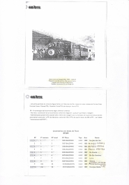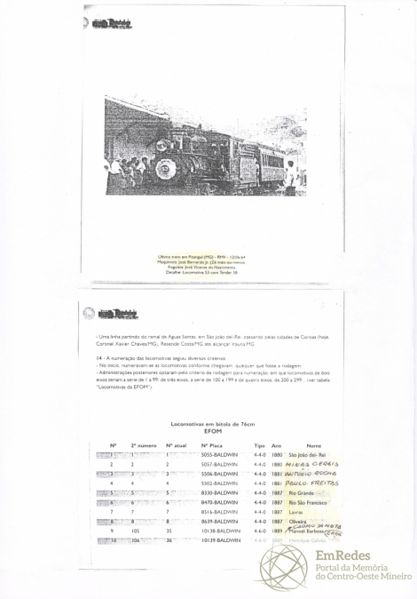 Imagem superior: Último trem em Pitangui (MG) – RMV – 12/06/64. Maquinista: José Bernardo Jr. (Zé mais-ou-menos). Foguista: José Vicente Nascimento. Detalhe: Locomotiva 53 com Tender 58. Imagem inferior: Descrição das numerações das locomotivas, modelos, ano de fabricação e Rede Ferroviárias as quais pertenciam.