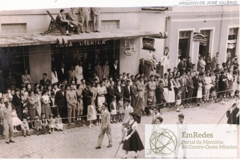 Desfile de 07 de setembro de 1949, quando passava pela Av. 1º de Junho. Destacam-se: 1) Em cima da marquise na cadeira de encosto está o Nivaldo, filho do Sr. José Natividade (Peixão). O Nivaldo, mais conhecido como Peixão casou-se com a Aparecida Sotero; 2) Os alunos da foto são do Ginásio São Geraldo; 3) Loja América foi muito tradicional, a sua esquerda, a loja do Lilito especialista em calçados finos; 4) Mercadinho Imperial a ao lado a Agência Sousa, de jornais, revistas e loterias do Sr, Oscar de Sousa, esposo da professora D. Hermínia Corgosinho e pai da saudosa Leda; 5) Judith do Mário Carroceiro ( Maria Gontijo da D. Chatinha). Obs: Todos os homens estão de paletós.