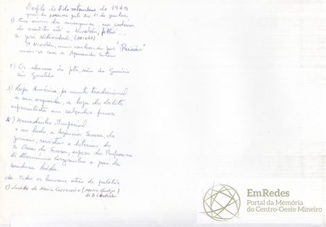 Nivaldo, José Natividade (Peixão), Aparecida Sotero, Lilito, Oscar de Sousa, Hermínia Corgosinho, Leda, Judth do Mário Carroceiro, Maria Gontijo da D. Chatinha, desfile, Av. 1º de Junho, 7 de setembro, Ginásio São Geraldo, Loja América, Mercadinho Imperial, Agência Sousa, jornais, revistas, loterias.