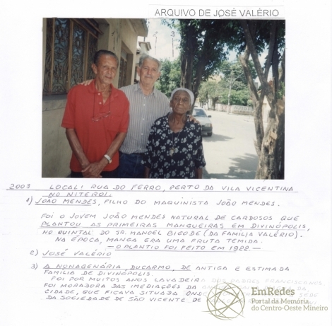 Foto tirada na rua do Ferro, perto da Vila Vicentina no Niterói. Nela destacam-se: João Mendes, filho do maquinista João Mendes. Foi o jovem João Mendes natural de Cardosos que plantou as primeiras mangueiras em Divinópolis, no quintal do Sr. Manoel Bigode (da família Valério) na época, manga era uma fruta temida. O plantio foi feito em 1922; 2) José Valério; 3) A nonagenária DuCarmo, de antiga e estimada família de Divinópolis. Foi por muitos anos lavadeira dos padres franciscanos. Foi moradora das imediações da antiga caixa d’água da cidade, que ficava situada onde construíram a sede da Sociedade de São Vicente de Paulo, na rua João Notini.