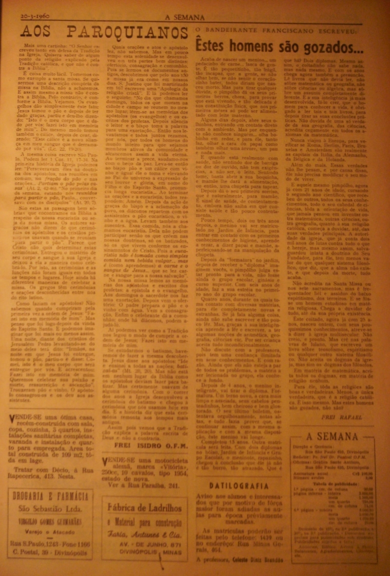 Comercialização do Ensino - Nacionalismo - Igreja Católica- Quaresma - Governo Diocesando - Frei Isidro - Frei Rafael - anúncios