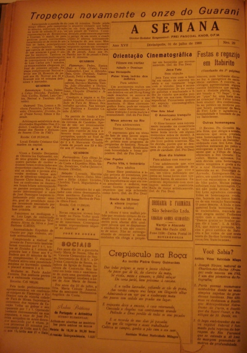 -EDIÇÃO N° 29. 31 DE JULHO DE 1960.REDATOR: FREI PASCOAL.