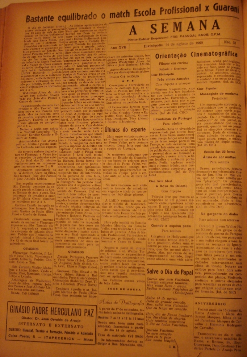 - EDIÇÃO N° 31. 14 DE AGOSTO DE 1960. REDATOR: FREI PASCOAL.