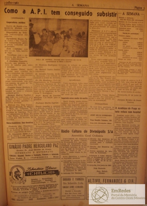 * Laboratório Clínico Chrlich, drogaria e farmácia São Sebastião, ginásio Padre Herculano Paz, Altivo, Fernandes e cia.