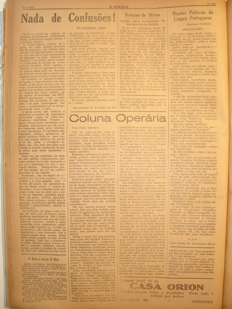 Notícias: Verdades que apertam; Paróquia do Divino Espírito Santo- Serviço religioso; Ação Católica; Evangelho; Paróquia de S. Antônio- Serviço religioso- Missas encomendadas; Congregação Mariana; Novos livros; Nada de confusões!; O rádio a serviço de Deus; Coluna Operária; Notícias de Minas: Verbas para a construção de Aeroportos no Estado; Noções de práticas da língua portuguesa; Rouxinol; Cotação Moral de filmes; Sistema novo de assistência às populações rurais; Cinema e Teatro; A cortina de ferro; Mar de rosas; Pedido.