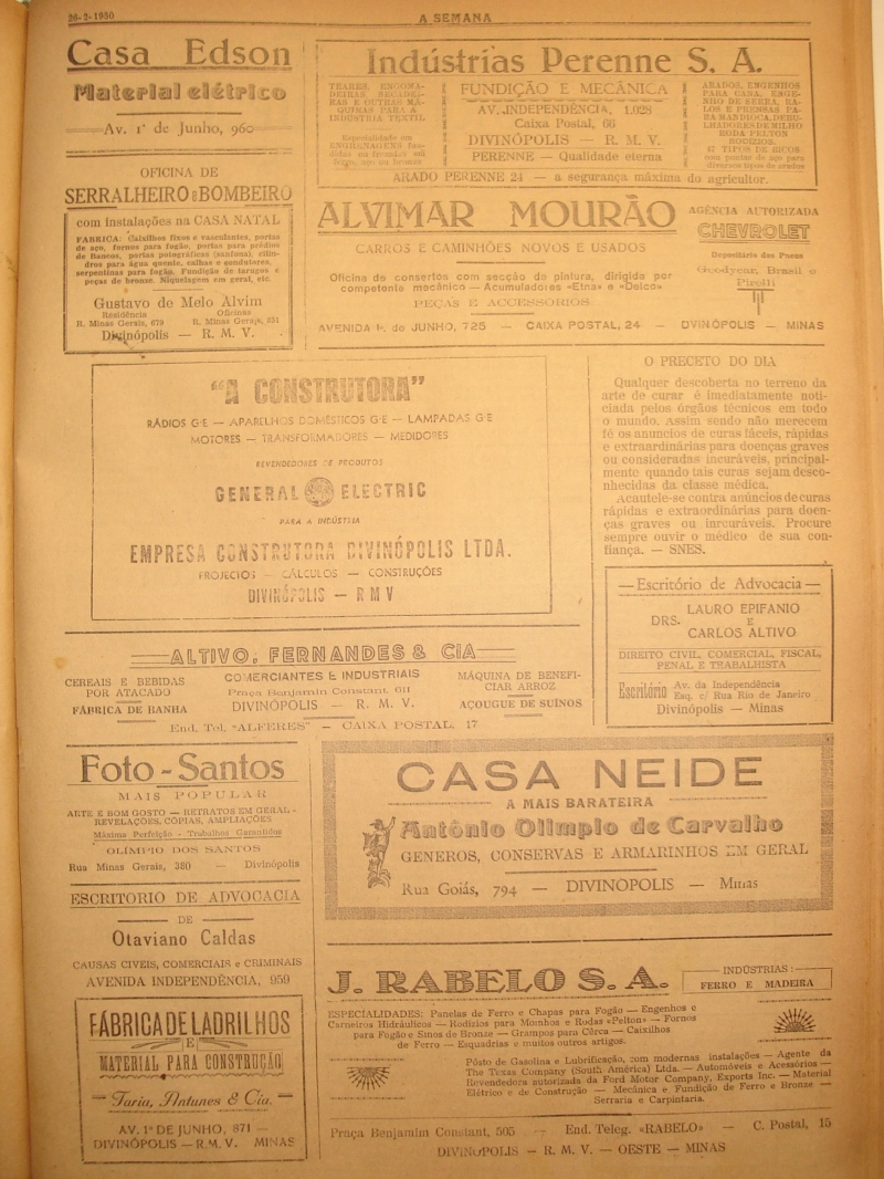 Publicidade: Casa Orion; Casa Edson; Indústrias Perenne S.A; Oficina de serralheiro e bombeiro; Alvimar Mourão; A construtora; Altivo. Fernandes e Cia; Foto- Santos; Escritório de Advocacia; Preceto do dia; F.R. de Aquino; Casa Neide; Papelaria e Livraria Fr. Orlando; Escritório de Advocacia de Otaviano Caldas; Fábrica de ladrilhos Faria Antunes e Cia; J. Rabelo S.A; Laboratório Clínico Ehrlich.