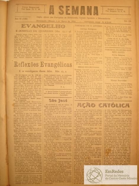Noticias: Evangelho; Paróquia de S. Antônio- Serviço religioso- Missas encomendadas; Paróquia do Divino Espírito Santo- Serviço religioso-Missas marcadas; Reflexões Evangélicas; São José, Ação Católica; Notícias de Minas: Ligação rodoviária entre Itaúna e Divinópolis, Produção leiteira em rico Município de Minas; Inaugurada uma Agência do S.A.M. em Belo Horizonte; Novos livros; O rádio a serviço de Deus; Anúncio de Hollywood; Cotação moral de filmes; No mundo Católico; Noções práticas da língua portuguesa; Informações Úteis: Horário dos trens da R.M.V-Horários de ônibus e jardineiras; Prefeitura Municipal de Divinópolis- Lei N° 128- Lei N° 129- Lei N° 130; Notas Sociais- Aniversários-Graças Alcançadas; Oração do trabalhado; Três milhões de peregrinos; Notícias das Missões; Coluna Operária; Cinema e Teatro; Paralitica, muda, cega e tuberculosa; Comarca de Divinópolis