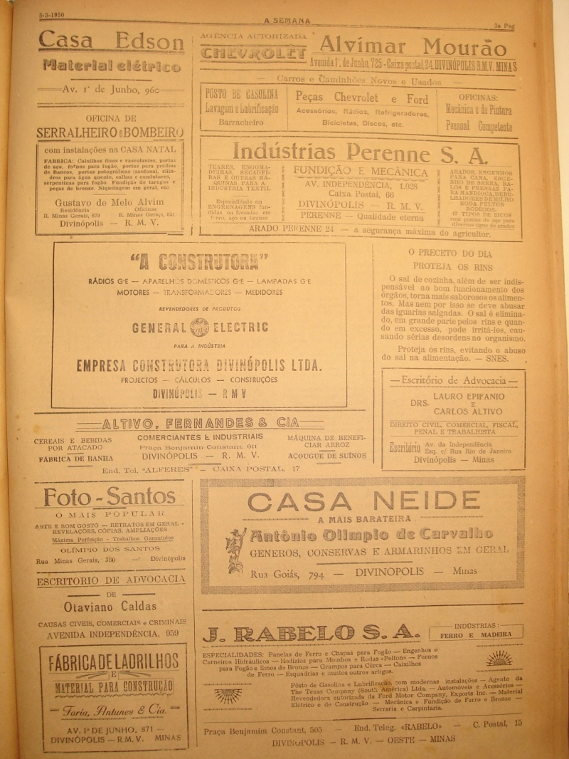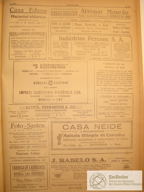 Publicidade: Casa Edson; Indústrias Perenne S.A; Oficina de serralheiro e bombeiro; Alvimar Mourão; A construtora; Altivo. Fernandes e Cia; Foto- Santos; Escritório de Advocacia; Preceto do dia; F.R. de Aquino; Casa Neide; Papelaria e Livraria Fr. Orlando; Escritório de Advocacia de Otaviano Caldas; Fábrica de ladrilhos Faria Antunes e Cia; J. Rabelo S.A; Casa Orion; Bazar Vitória.