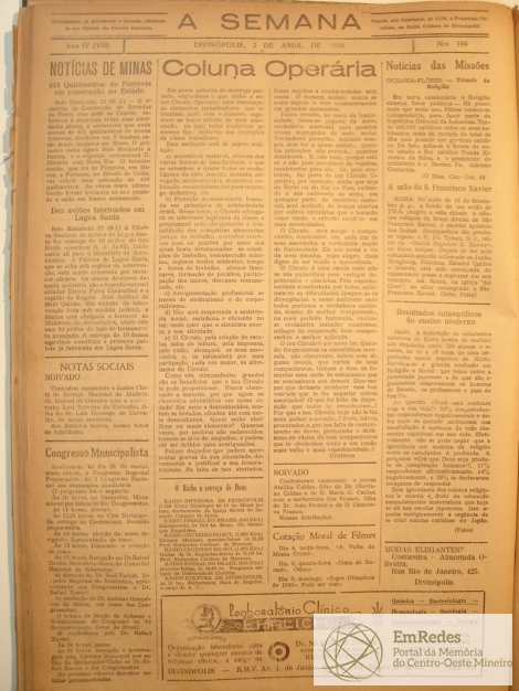 Notícias: Evangelho; Reflexões Evangélicas; Aviso; Ação Católica; Paróquia de S. Antônio-Serviço Religioso-Missas Encomendadas- Adoração Noturna- Jejum e Abstinência- Festa de Santo Antônio; Aviso; O passo do chacal; Uma grande nação; Comarca de Divinópolis; Novos livros; Obrigações fiscais; Noções práticas da língua portuguesa; Notícias de Minas: 618 quilômetros de ferrovia em construção no Estado, Dez aviões fabricados em Lagoa Santa; Notas Sociais: Noivado; Congresso Municipalista; O rádio a serviço de Deus; Coluna Operária; Cotação moral de filmes; Notícias das missões: Oceania- A mão de São Francisco Xavier; Resultados Catastróficos do ensino moderno.