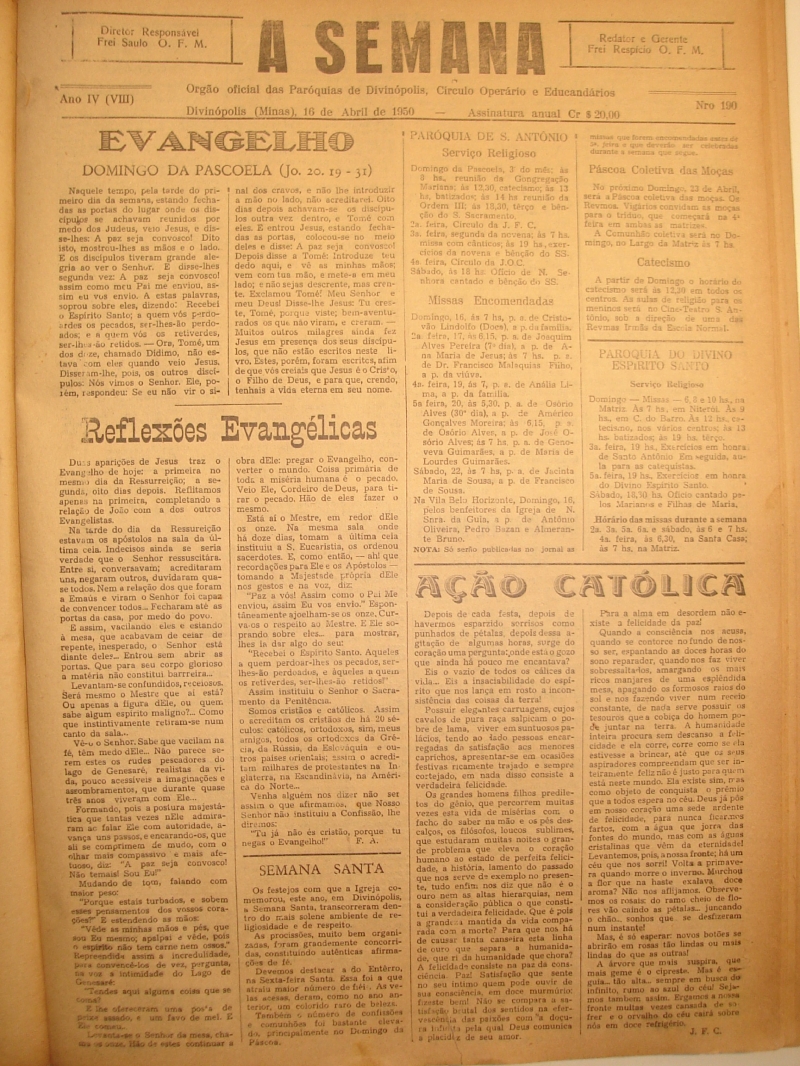 EDIÇÃO NÚMERO 190 DE 16 DE ABRIL DE 1950. DIRETOR RESPONSÁVEL: FREI SAULO O.F.M