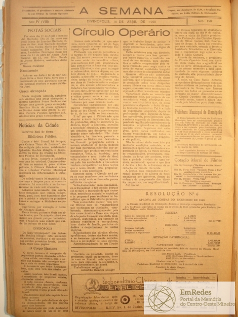 Notícias: Evangelho; Reflexões Evangélicas; Semana Santa; Ação Católica; Paróquia de S. Antônio: Serviço religioso- Missas encomendadas- Páscoa coletiva das Moças; Catecismo; Paróquia do Divino Espírito Santo: Serviço religioso- Horário das missas durante a semana; O fim de Tarzan; Prefeitura Municipal de Divinópolis: Lei N° 136- Lei N° 137- Lei N° 138; O rádio a serviço de Deus; Notícias de Minas: Colégio Internacional de Cirurgiões, Impressionante aumento da produção agrícola em Minas, Vasado o primeiro túnel de Salto Grande, Mineiros em Roma, As desincompatibilizações; Comarca de Divinópolis; Notas Sociais: Nascimento- Graça Alcançada; Notícias da cidade: Biblioteca Pública, Divinópolis, O corpo Humano; Círculo Operário; Cotação moral de filmes; Prefeitura Municipal de Divinópolis; Resolução N°6.