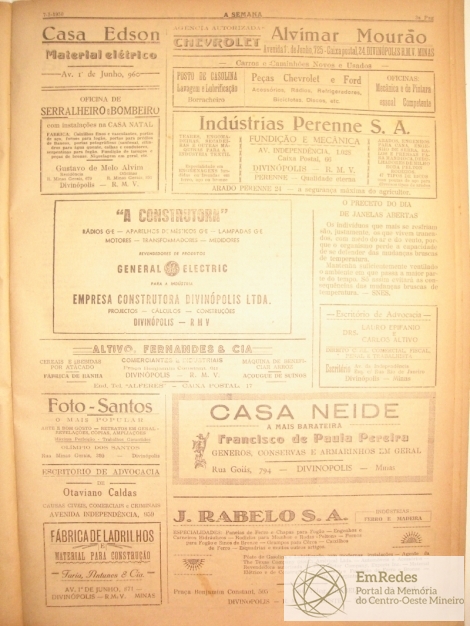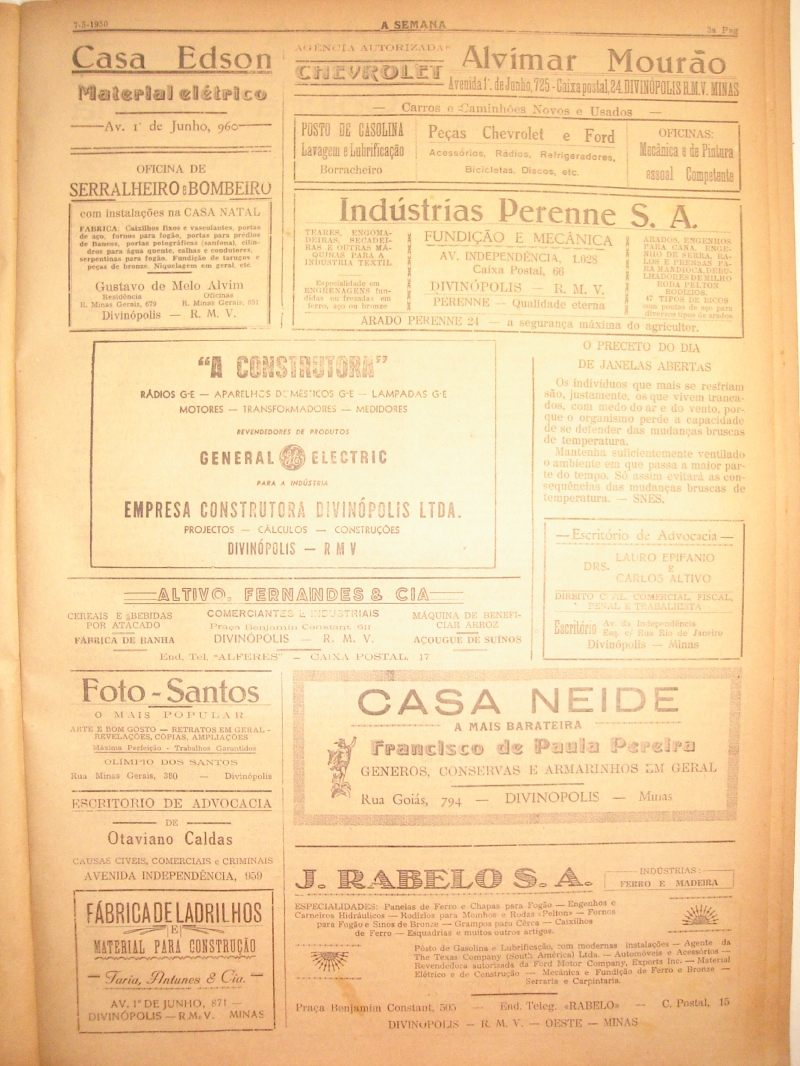 Publicidade: Bazar Vitória; Casa Orion; Casa Edson; Indústrias Perenne S.A; Oficina de serralheiro e bombeiro; Alvimar Mourão; A construtora; Altivo. Fernandes e Cia; Foto- Santos; Escritório de Advocacia; Preceto do dia; F.R. de Aquino; Casa Neide; Papelaria e Livraria Fr. Orlando; Escritório de Advocacia de Otaviano Caldas; Fábrica de ladrilhos Faria Antunes e Cia; J. Rabelo S.A; Laboratório Ehrlich; Aluga-se barracão, Vende-se tarraxa.