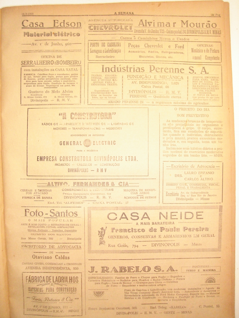 Publicidade: Bazar Vitória; Casa Orion; Casa Edson; Indústrias Perenne S.A; Oficina de serralheiro e bombeiro; Alvimar Mourão; A construtora; Altivo. Fernandes e Cia; Foto- Santos; Escritório de Advocacia; Preceto do dia; F.R. de Aquino; Casa Neide; Papelaria e Livraria Fr. Orlando; Escritório de Advocacia de Otaviano Caldas; Fábrica de ladrilhos Faria Antunes e Cia; J. Rabelo S.A; Laboratório Ehrlich