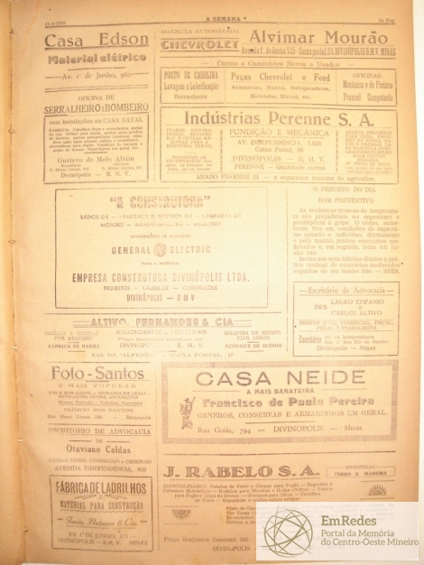 EDIÇÃO NÚMERO 195 DE 21 DE MAIO DE 1950. DIRETOR RESPONSÁVEL: FREI SAULO O.F.M Notícias: Evangelho; Reflexões Evangélicas; Paróquia de S. Antônio: Serviço religioso-Páscoa dos militares- Missas marcadas; Paróquia do divino Espirito Santo: Festa do Divino e Santo; Divinópolis; O trabalho de Apostolado Moderno de Frei de Mojica; Qual o maior homem do século; Noticias das missões; Noticias de Minas: Ampla campanha contra a doença de chagas, arrecadação do imposto de renda em Minas, Preparativos para o recenseamento geral; Badaladas; Câmara Municipal de Divinópolis; Cotação Moral de filmes; Tintas; A cruz do monte; Notas Sociais: Aniversários; Sociedade de S. Vicente de Paulo; Festa do Divino; Novos livros; Crianças na Rússia; O preço da paz; Aviso aos interessados. Publicidade: Casa Orion; Bazar Vitória; Casa Edson; Indústrias Perenne S.A; Oficina de serralheiro e bombeiro; Alvimar Mourão; A construtora; Altivo. Fernandes e Cia; Foto- Santos; Escritório de Advocacia; Preceto do dia; F.R. de Aquino; Casa Neide; Papelaria e Livraria Fr. Orlando; Escritório de Advocacia de Otaviano Caldas; Fábrica de ladrilhos Faria Antunes e Cia; J. Rabelo S.A; Laboratório Ehrlich.