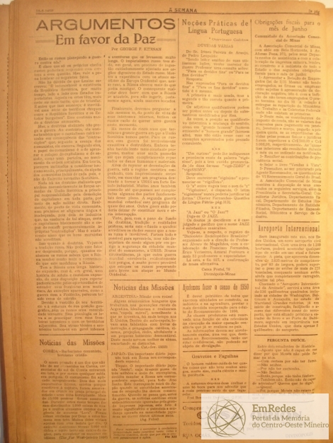 Notícias: Evangelho; Reflexões evangélicas; Paróquia de S. Antônio: Serviço religioso-Missas marcadas; Paróquia do Divino Espirito Santo: Serviço religioso-Sociedade de S. Vicente de Paulo; 38° aniversário de Divinópolis; Cotação moral de filmes; Argumentos; Notícias das missões: Coréia- Argentina-Japão; Noções práticas de língua portuguesa; Obrigações fiscais para o mês de junho; Aeroporto internacional; Ajudemos fazer o censo; Gravetos e fagulhas; Pergunta difícil; Mãos; Notas Sociais: Aniversários; Rabiscos; Desfile de boas notícias; Coluna circulista; Prefeitura Municipal de Divinópolis: Lei N°144.