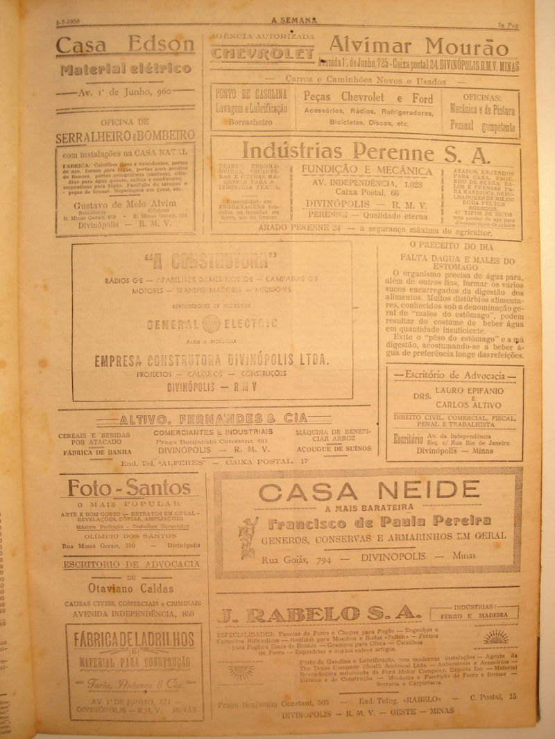Publicidade: Casa Orion; F.R. Aquino-Cirurgião dentista; Casa Edson; Indústrias Perenne S.A; Oficina de serralheiro e bombeiro; Alvimar Mourão; A construtora; Altivo. Fernandes e Cia; Foto- Santos; Escritório de Advocacia; Preceto do dia; F.R. de Aquino; Casa Neide; Papelaria e Livraria Fr. Orlando; Escritório de Advocacia de Otaviano Caldas; Fábrica de ladrilhos Faria Antunes e Cia; J. Rabelo S.A; Laboratório Clínico Ehrlich; Dr. José Chaves- Moléstias de adultos e crianças.