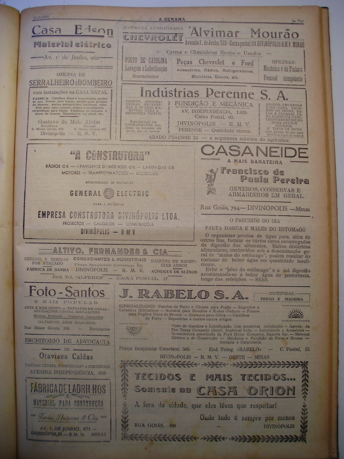 Publicidade: Silva Alfaiataria; F.R. Aquino-Cirurgião dentista; Casa Edson; Indústrias Perenne S.A; Oficina de serralheiro e bombeiro; Alvimar Mourão; A construtora; Altivo. Fernandes e Cia; Foto- Santos; Escritório de Advocacia; Preceto do dia; F.R. de Aquino; Casa Neide; Papelaria e Livraria Fr. Orlando; Escritório de Advocacia de Otaviano Caldas; Fábrica de ladrilhos Faria Antunes e Cia; J. Rabelo S.A; Casa Orion; Laboratório Clínico Ehrlich; Dr. José Chaves- Moléstias de adultos e crianças.