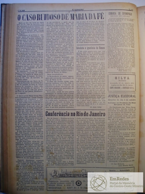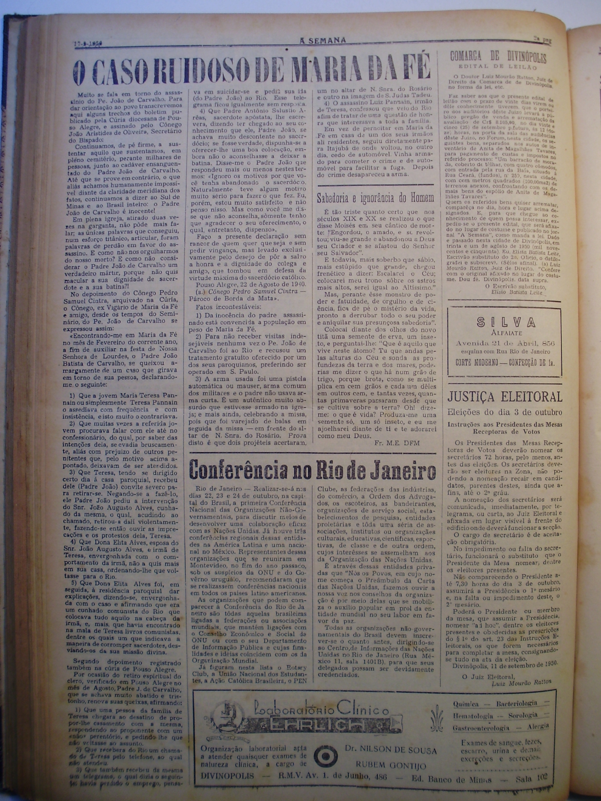 Notícias: Evangelho; Reflexões evangélicas; Paróquia de S. Antônio: Serviço religioso- Missas marcadas; Paróquia do Divino Espírito Santo: Serviço religioso- Niterói; A caridade Vicentina pela Eucaristia; O caso ruidoso de Maria da Fé; Conferência no Rio de Janeiro; Sabedoria e Ignorância do homem; Comarca de Divinópolis; Justiça Eleitoral; Soneto; Coluna Circulista; Cotação moral de filmes; A palavra de orientação da liga eleitoral católica; Justiça eleitoral-Edital de aviso.