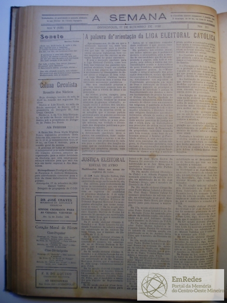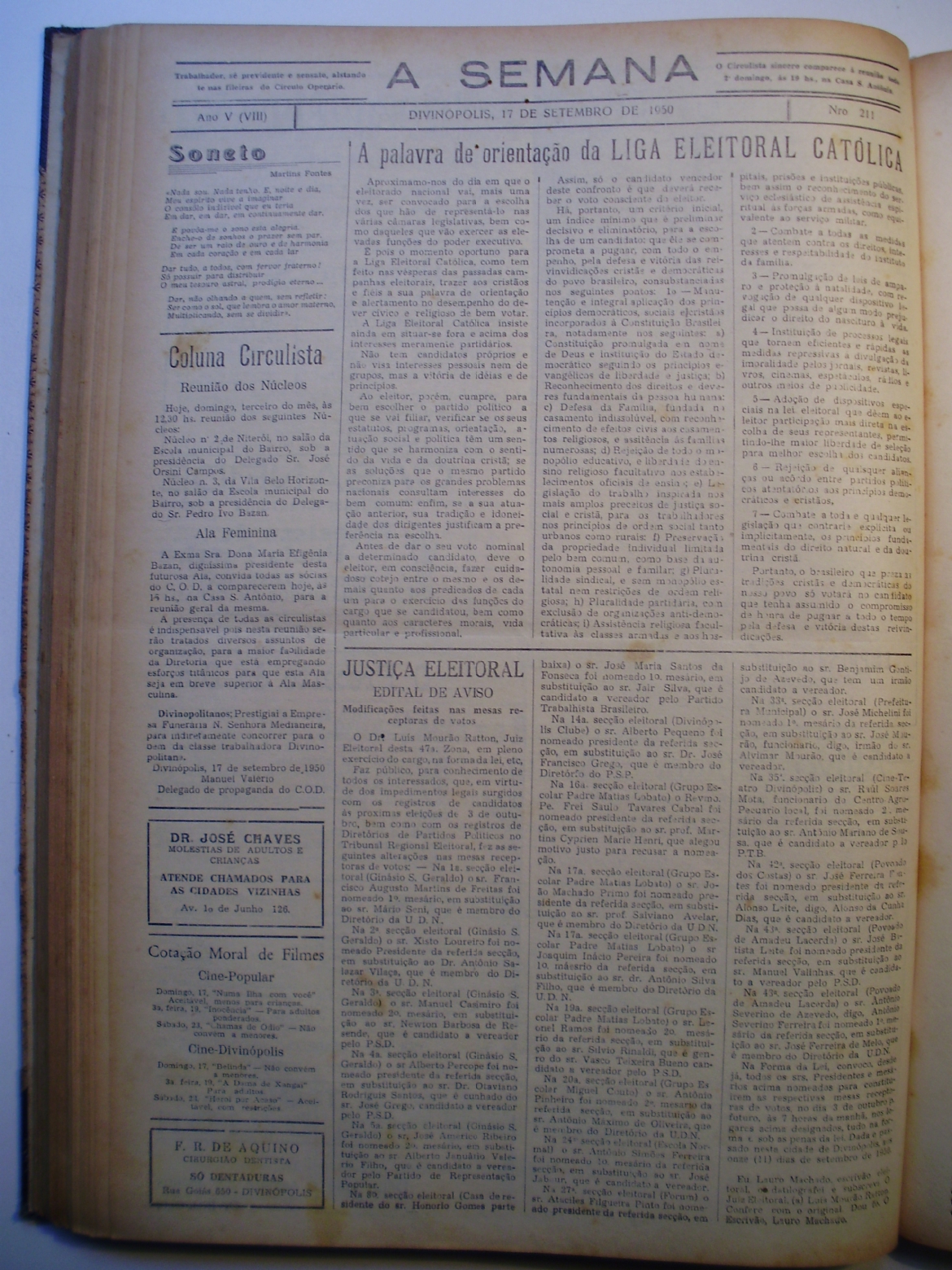 Notícias: Evangelho; Reflexões evangélicas; Paróquia de S. Antônio: Serviço religioso- Missas marcadas; Paróquia do Divino Espírito Santo: Serviço religioso- Niterói; A caridade Vicentina pela Eucaristia; O caso ruidoso de Maria da Fé; Conferência no Rio de Janeiro; Sabedoria e Ignorância do homem; Comarca de Divinópolis; Justiça Eleitoral; Soneto; Coluna Circulista; Cotação moral de filmes; A palavra de orientação da liga eleitoral católica; Justiça eleitoral-Edital de aviso.