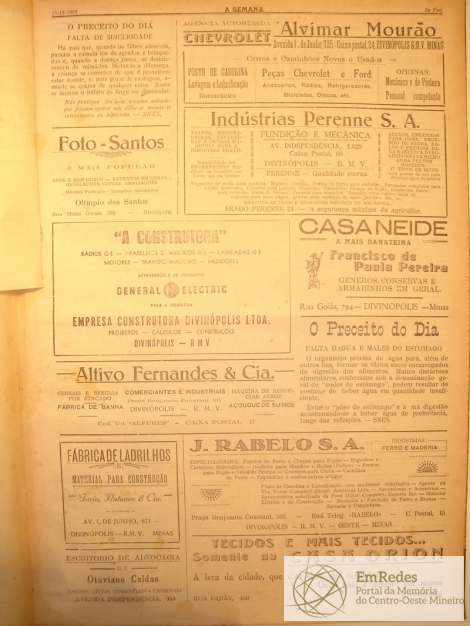 EDIÇÃO NÚMERO 225 DE 17 DE DEZEMBRO DE 1950. DIRETOR RESPONSÁVEL: FREI SAULO O.F.M Notícias: Evangelho; Paróquia de S. Antônio: Serviço religioso- Missas marcadas; Paróquia do Divino Espirito Santo: Serviço religioso; Apostolado da oração; Retiro para homens; Associação de proteção à infância de Divinópolis; Câmara Municipal de Divinópolis; Madre Maria Anastácia; O louco de Nossa Senhora; Noções práticas de língua portuguesa; Comarca de Divinópolis; Formatura na escola do Alto Catalão; Perdeu-se um titulo da aliança da Bahia; Notas Sociais: Aniversário- Bodas de prata- Agradecimentos; Graças Alcançadas; A rua onde moro; Energia na luta; Convite; Latim na igreja; Sindicato dos trabalhadores nas indústrias de fiação e tecelagem de Divinópolis; Fotografia da nova sede da ONU. Publicidade: Casas Pernambucanas; José Chaves- Moléstias de adultos e crianças; ; Laboratório clínico Ehrlich; Indústrias Perenne S.A; Oficina de serralheiro e bombeiro; Alvimar Mourão; A construtora; Altivo. Fernandes e Cia; Foto- Santos; Escritório de Advocacia; Preceto do dia; F.R. de Aquino; Casa Neide; Papelaria e Livraria Fr. Orlando; Escritório de Advocacia de Otaviano Caldas; Fábrica de ladrilhos Faria Antunes e Cia; J. Rabelo S.A; Casa Orion; Dr. Eliza Franca.