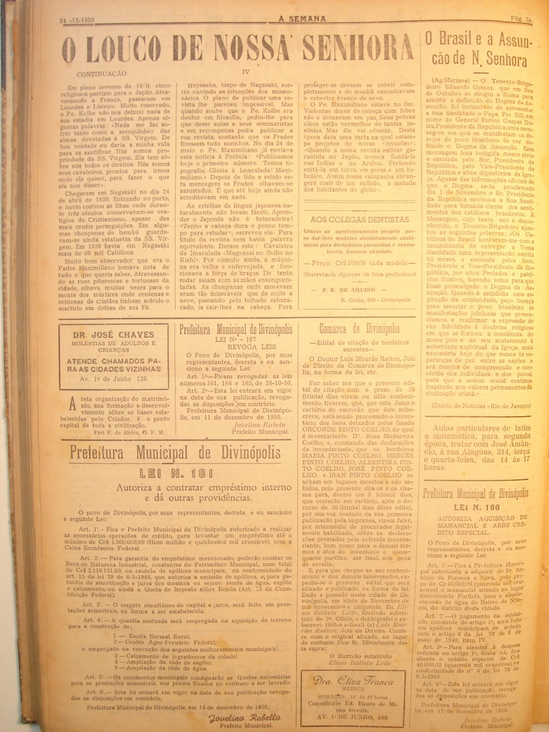 Notícias: Evangelho; Paróquia de S. Antônio: Serviço religioso- Missas marcadas; Apostolado da oração; Paz e Bem; Natal; O louco de Nossa Senhora; Comarca de Divinópolis; Prefeitura Municipal de Divinópolis: Lei N° 163- Lei N° 166- Lei N° 167- Lei N° 169- Lei N° 181; O Brasil e a Assunção de N. Senhora; Notas sociais: Casamentos-Graça alcançada; Retiro recluso para os homens; Diplomação do 4° ano primário em Mata dos Coqueiros; Saiu do (*ilegível*) o almanaque de N. Sra. Aparecida; Agente de automóvel; Velha anedota.