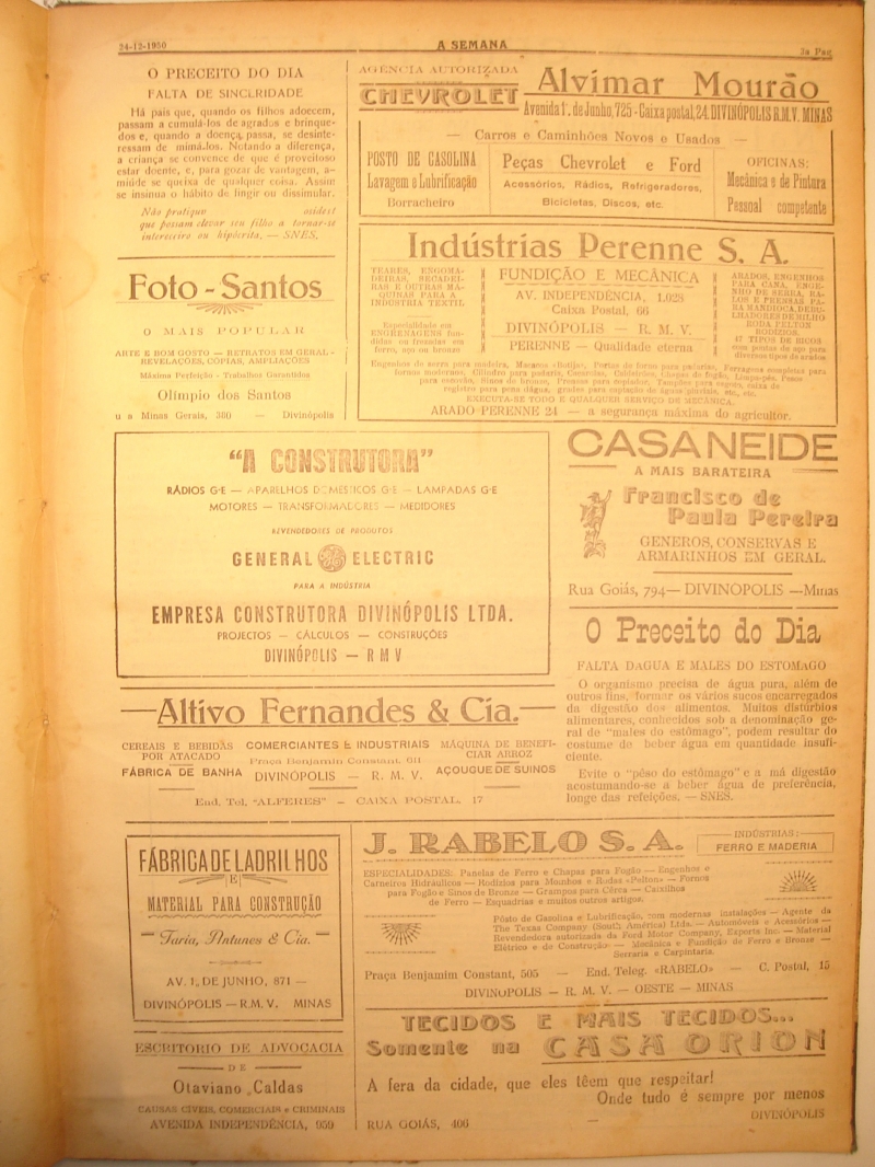 Publicidade: Casas Pernambucanas; José Chaves- Moléstias de adultos e crianças; Dr. Eliza Franca; Aulas particulares de latim e matemática; Indústrias Perenne S.A; Oficina de serralheiro e bombeiro; Alvimar Mourão; A construtora; Altivo. Fernandes e Cia; Foto- Santos; Escritório de Advocacia; Preceito do dia; F.R. de Aquino; Casa Neide; Papelaria e Livraria Fr. Orlando; Escritório de Advocacia de Otaviano Caldas; Fábrica de ladrilhos Faria Antunes e Cia; J. Rabelo S.A; Casa Orion; Laboratório clínico Ehrlich.