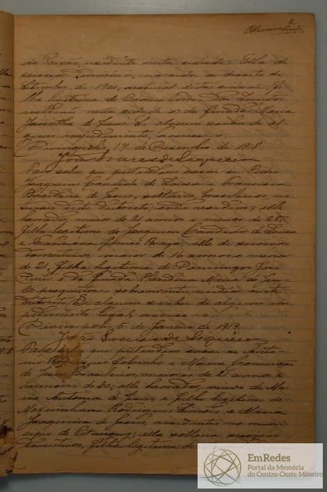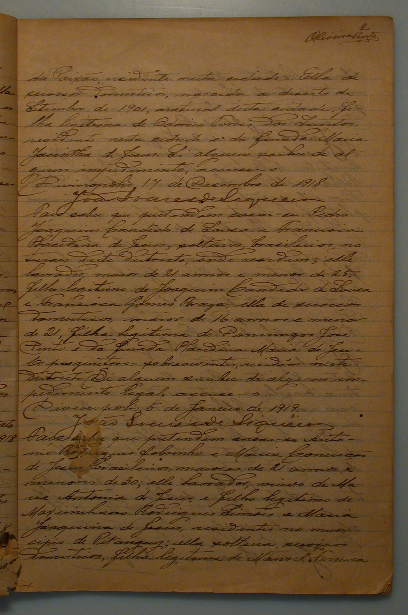 NUBENTES: FRANCISCO GOMES DOS SANTOS, NATURAL DE OLIVEIRA NESTE ESTADO, NASCIDO 18 DE JULHO DE 1897, FILHO LEGITIMO DO FINADO SEBASTIÃO JOSÉ DO SANTOS E DE MARIA GOMES DA PAIXÃO, RESIDENTE NESTA CIDADE; E CORINA TORRES DOS SANTOS, NASCIDA A 18 DE SETEMBRO DE 1901, NATURAL DESTA CIDADE, FILHA LEGITIMA DE ODORICO TORRES DOS SANTOS E DA FINADA MARIA JACINTHA DE JESUS.
