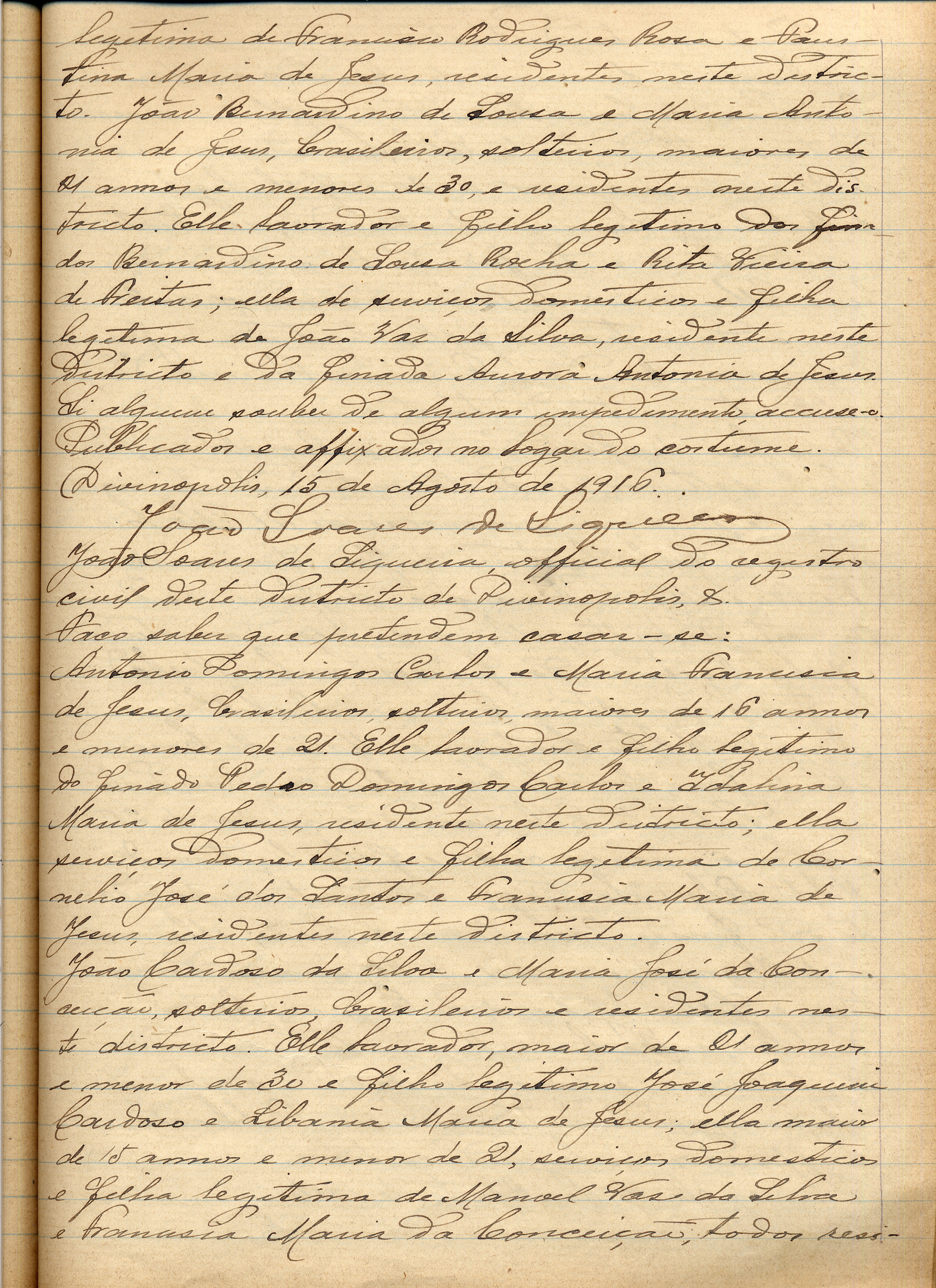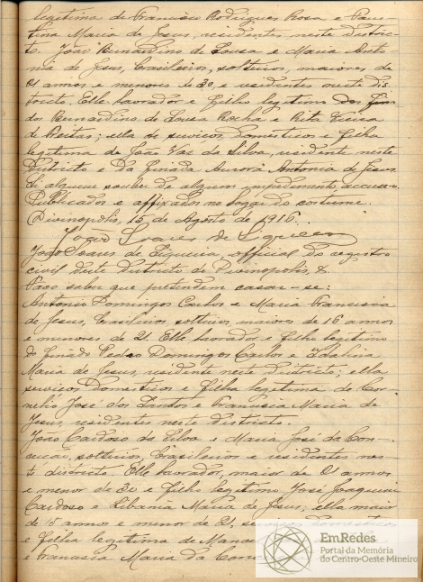NUBENTES: ANTONIO DOMINGOS CARLOS, LAVRADOR, MAIOR DE 16 ANOS E MENOR DE 21, FILHO LEGITIMO DO FINADO PEDRO DOMINGOS CARLOS E DE IDALINA MARIA DE JESUS E MARIA FRANCISCA DE JESUS, SERVIÇOS DOMÉSTICOS, MAIOR DE 16 ANOS E MENOR DE 21, FILHA LEGITIMA DE CORNÉLIO JOSÉ DOS SANTOS E DE FRANCISCA MARIA DE JESUS.