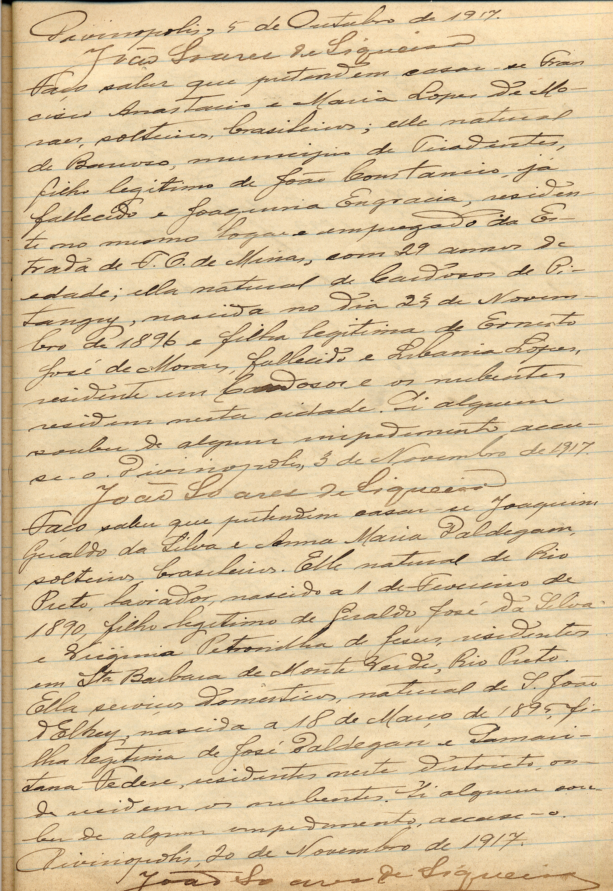 NUBENTES: FRANCISCO ANASTÁCIO, 29 ANOS, SOLTEIRO, NATURAL DE BARROSO, MUNICÍPIO DE TIRADENTES, EMPREGADO NA ESTRADA DE FERRO OESTE DE MINAS, FILHO LEGITIMO DO FALECIDO JOÃO CONSTANCIO E JOAQUINA ENGRÁCIA E RESIDENTES NO MESMO MUNICÍPIO E MARIA LOPES DE MORAIS, SOLTEIRA, NASCIDA EM 23 DE NOVEMBRO DE 1896, PORTANTO, COM 20 ANOS, NATURAL DE CARDOSOS DO PITANGUY, FILHA LEGITIMA DO FALECIDO ERNESTO JOSÉ DE MORAES E LIBANIA LOPES, RESIDENTES EM CARDOSOS.