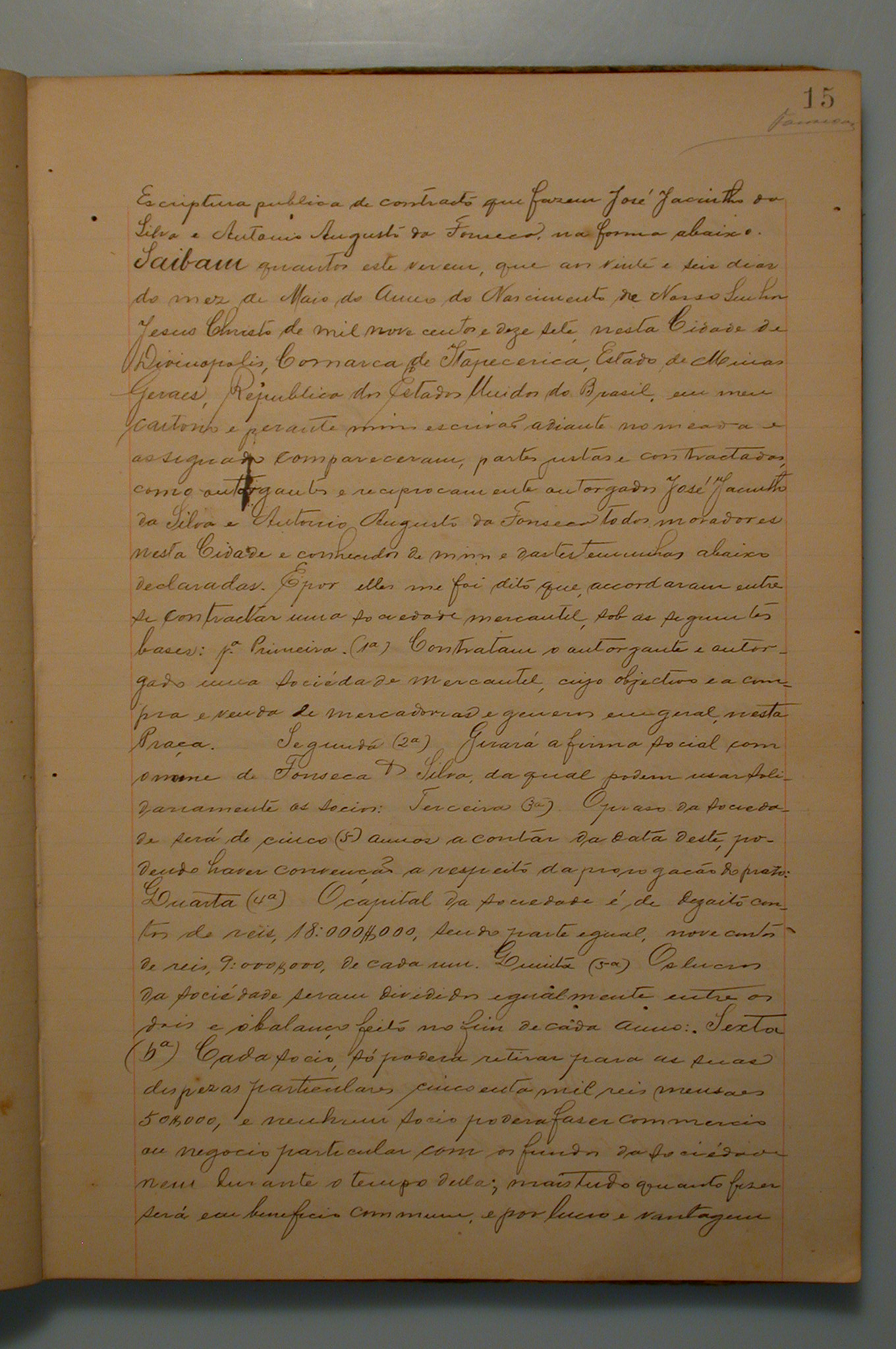 ESCRITURA PÚBLICA DE CONTRATO QUE FAZEM JOSÉ JACINTO DA SILVA E ANTÔNIO DA FONSECA AOS 26 DIAS DO MÊS DE MAIO DE 1917 NESTA CIDADE DE DIVINÓPOLIS QUE ACORDARAM ENTRE SI CONTRATAR UMA SOCIEDADE MERCANTIL.