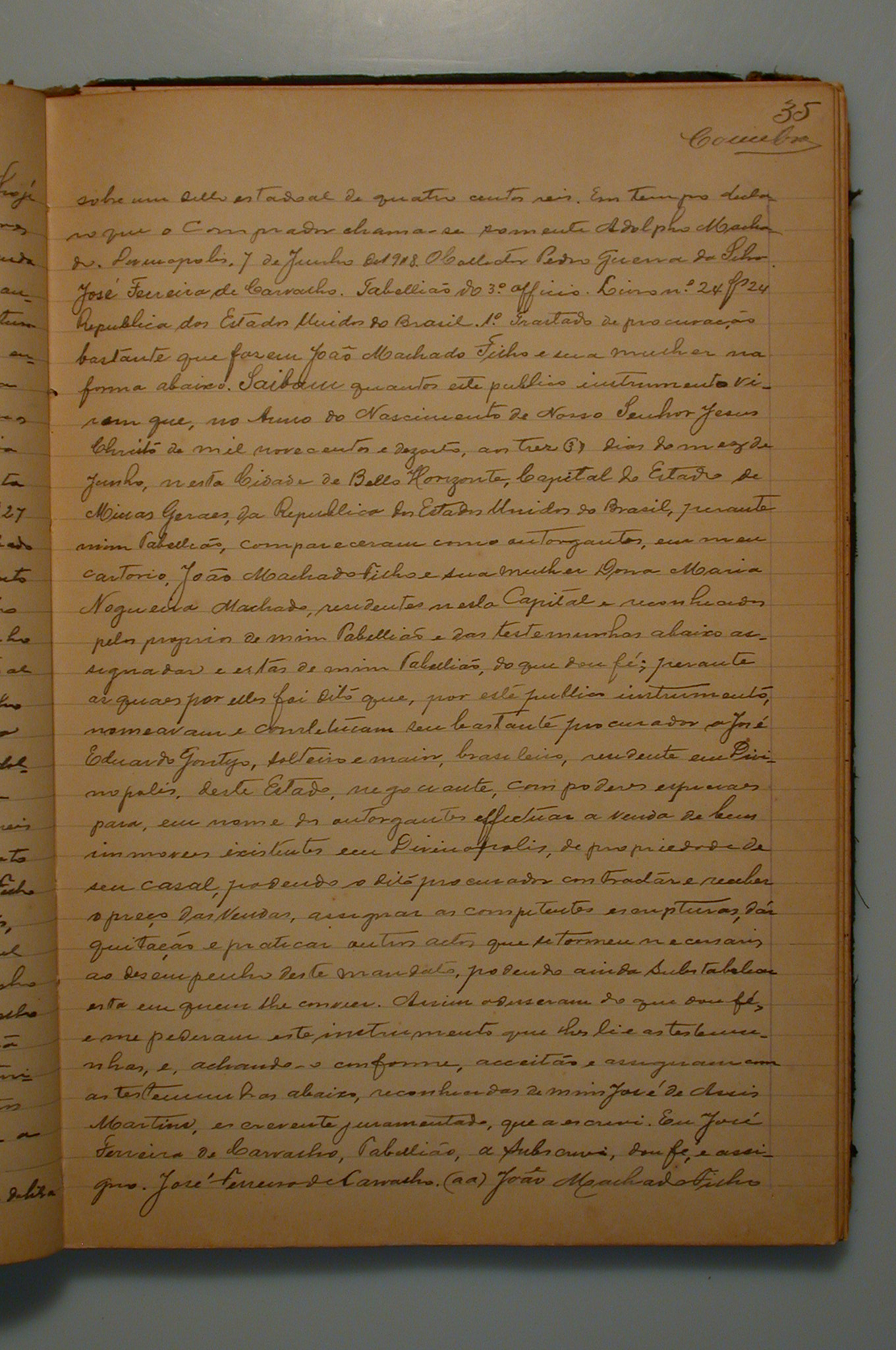 ESCRITURA PÚBLICA DE COMPRA E VENDA DE BENS RAIZ QUE FASEM JOÃO MACHADO FILHO E SUA MULHER DONA MARIA NOGUEIRA MACHADO, AOS 08 DIAS DO MÊS JUNHO DE 1918, A VENDA DE UMA CASA COBERTA DE TELHAS COM CÔMODO DE NEGOCIO E ARMAZÉM TÉRREO, SITA NA PRAÇA DA MATRIZ DESSA CIDADE, PELA QUANTIA DE 1 CONTO E 500 MIL RÉIS.