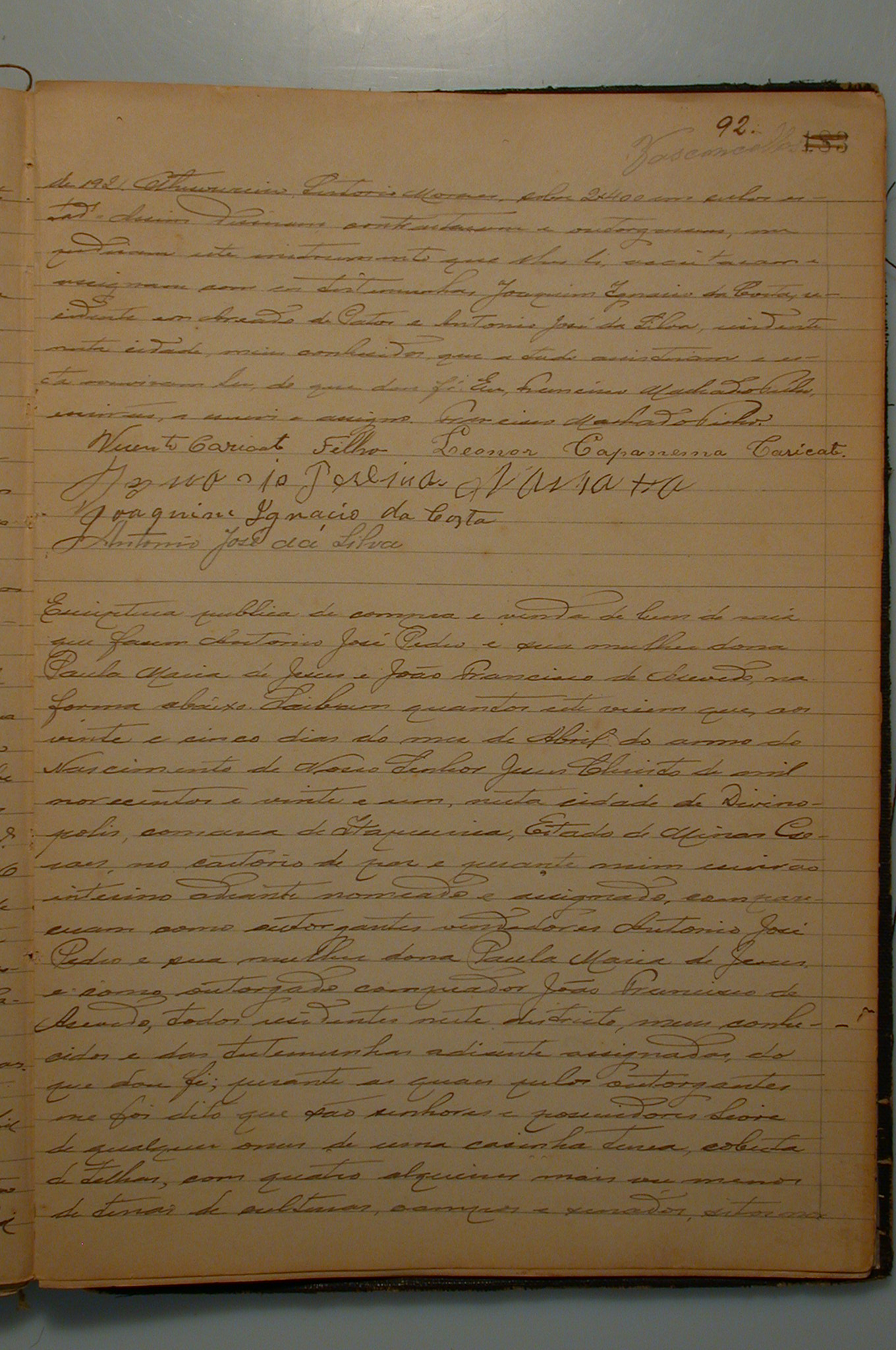 ESCRITURA PÚBLICA DE COMPRA E VENDA DE BENS DE RAIZ QUE FAZEMVICENTE CARICATI FILHO E SUA MULHER LEONOR CARICATI AO COMPRADOR IGNÁCIO PEREIRA MARATTA DE UMA CASA, COM MIL OITOCENTOS METROS QUADRADOS DE TERRENO, SITUADA NA RUA GOIAS, NESTA CIDADE DE UM CONTO DE RÉIS.