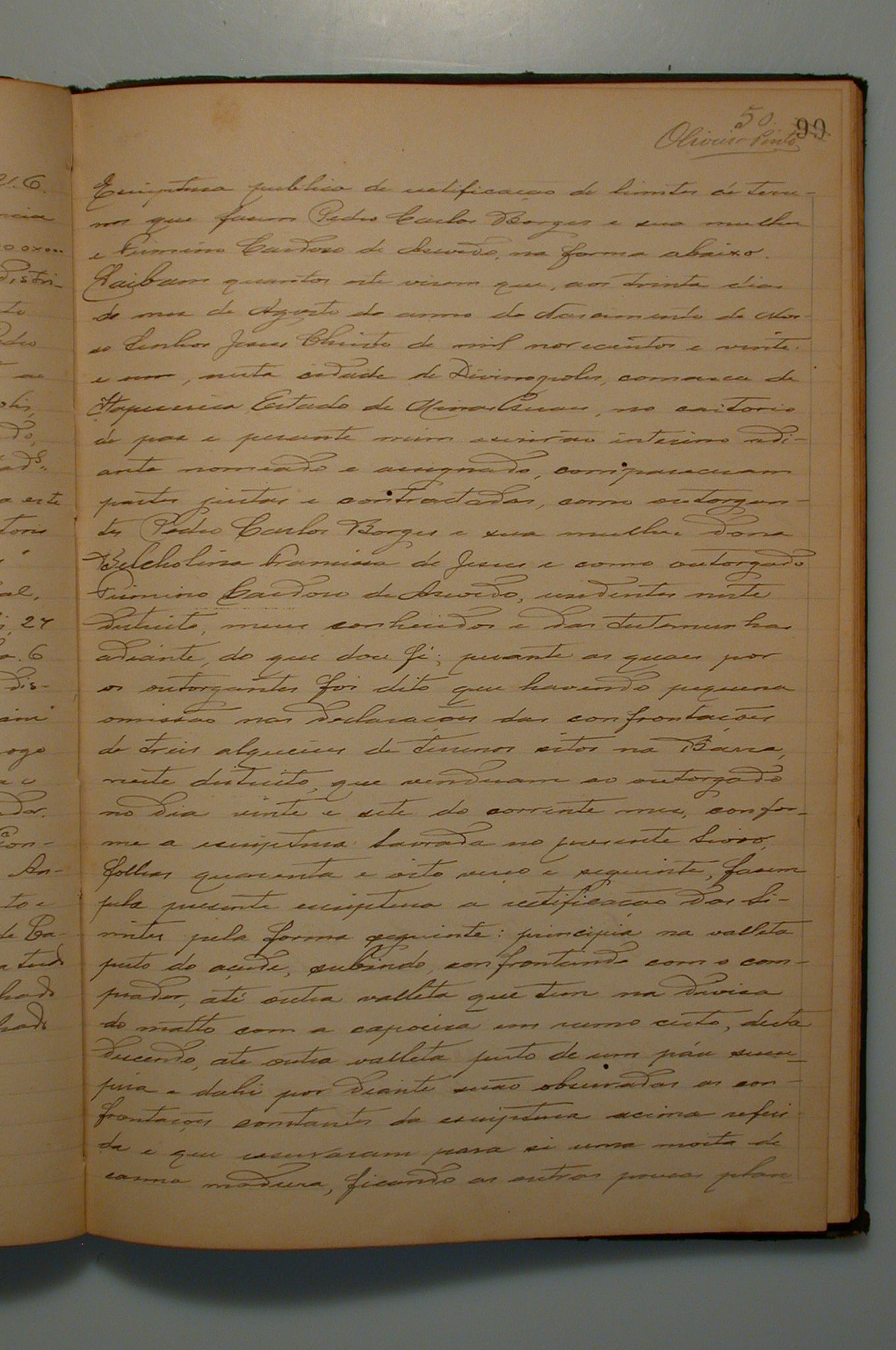 ESCRITURA PÚBLICA DE RECTIFICAÇÃO DE LIMITES DE TERRENOS QUE FAZEM PEDRO CARLOS BORGES E SUA MULHER BELCHOLINA FRANCISCA DE JESUS, A FIRMINO CARDOSO DE ASEVEDO, PELOS QUAIS FOI DITO QUE HAVENDO PEQUENA OMISSÃO NAS DECLARAÇÕES DE CONFRONTAÇÕES DE TRÊS ALQUEIRES DE TERRAAS, SITOS NA BARRA, NESTE DISTRITO QUE VENDERAM AO OUTORGADO COMPRADOR NO DIA VINTE E SETE DO CORRENTE MÊS.